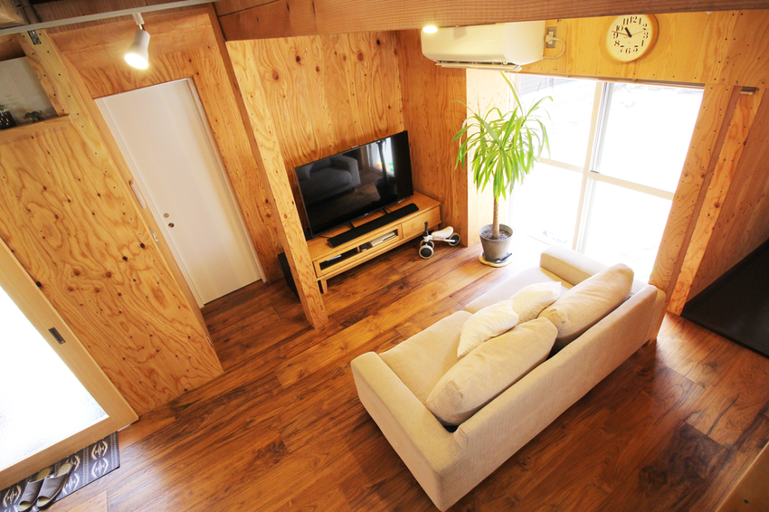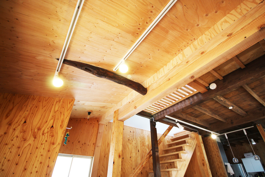 壁は構造用合板(その他、金物・耐震部材)で補強を行い、ベニヤ仕上の内装としユニークな表情ある空間とした。